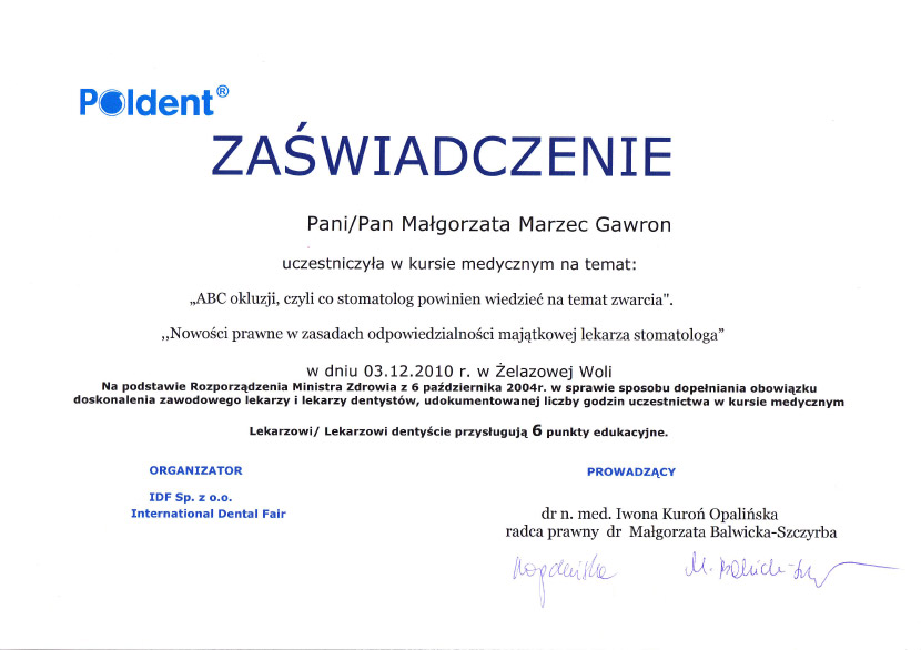 Poldent ,03.12.2010, dr. n. med. Iwona Kuroń Opalińska, radca prawny dr. Małgorzata Balwicka Szczyrba.