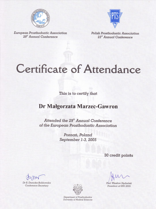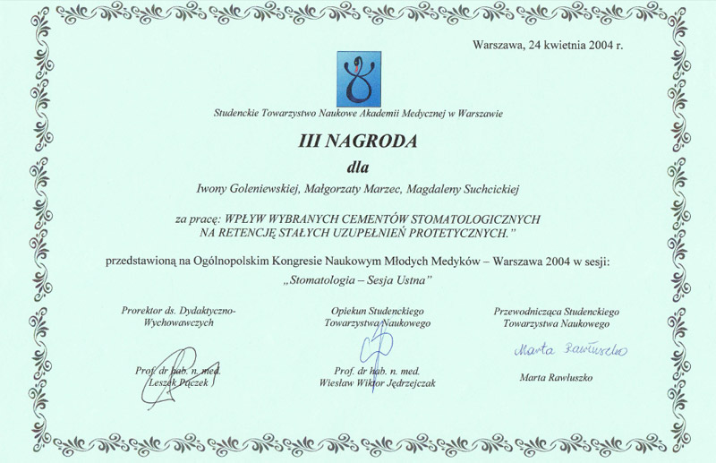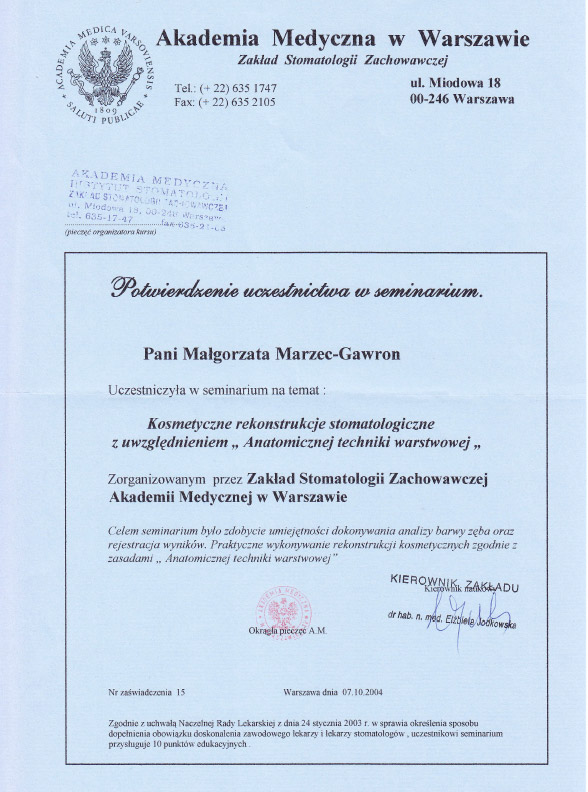 07.10.2004 Zakład Stomatologii Zachowawczej AM w Warszawie, kierownik naukowy dr. hab. n. med. Elżbieta Jodkowska .